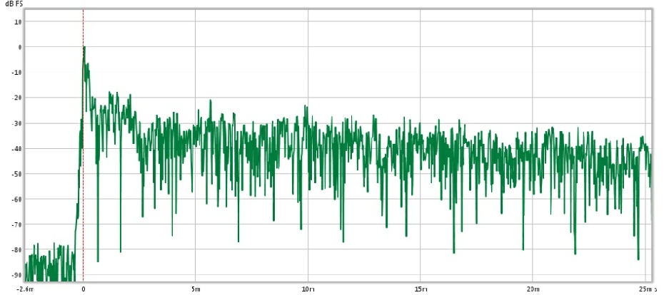 The method used to achieve reflections lower than 20db within the first 20ms is via room testing, and specifically use of the Energy Time Curve plot. Below as an example untreated room ETC taken at the listening position :